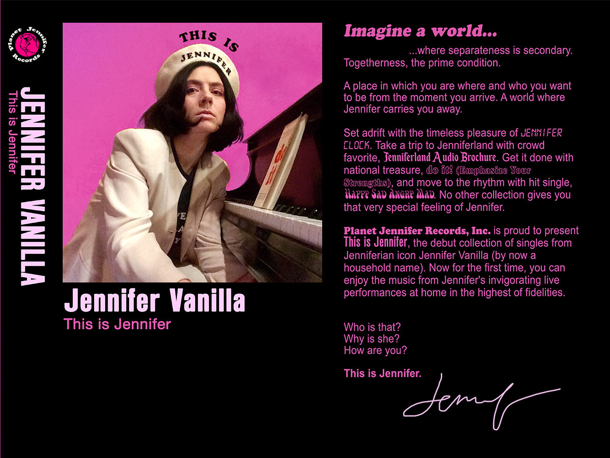 Be your best Jennifer, with your very own Jennifer Vanilla wearable merchandise. Made by Jennifer herselves at the renowned Jennifer Vanilla T-Shirt Factory-- open 365 times per blink!!!